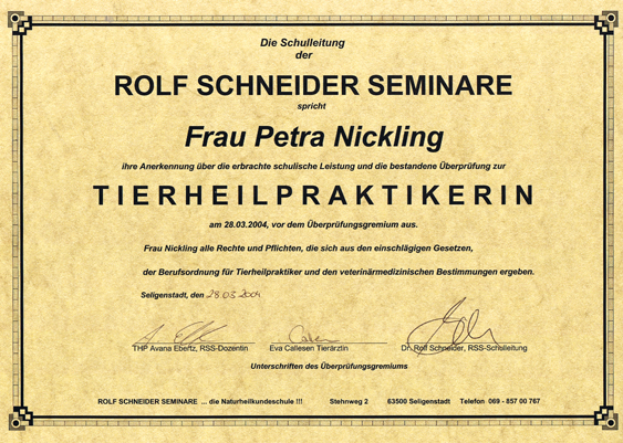 Da mir das Wohl meiner Tiere sehr am Herzen liegt, habe ich eine Ausbildung zum Tierheilpraktiker absolviert. Ausschlag gebend hierfür war eigentlich mein Hund, der mit 4,5 Jahren viel zu früh sterben musste. Nach zahlreichen Operationen musste ich ihn doch wegen Krebs im Unterkiefer einschläfern lassen.